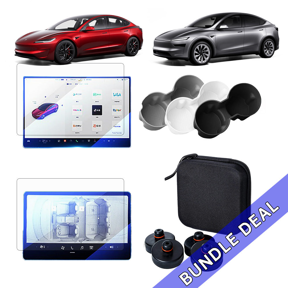 Kick off your journey with our Essential Accessories Starter Kit, tailored specifically for the Tesla Model 3 Highland and Model Y Juniper. Our kit includes the three fundamental accessories recommended by our experts: the Screen Protector Kit, the Rattle-Free Drink Cup Holder Insert, and a set of Jack Pucks.